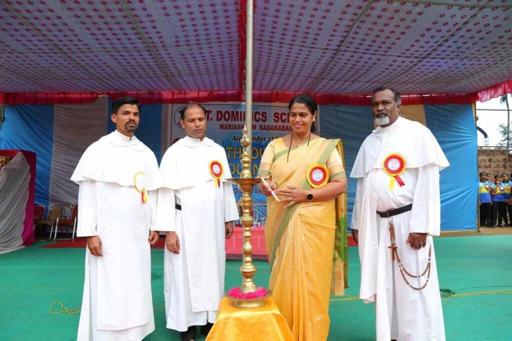 The inaugural ceremony commenced with a majestic march led by the school band, escorting the Chief Guest, Mrs Lily Pais (District President of Karnataka P.ED Committee). The dignitaries, including the Principal Rev. Fr. Francis Arun D’Souza, the Correspondent Rev. Fr. Reginald Dmello, and the Financial Administrator Rev. Fr. Sunil Christopher D’Souza, participated in the traditional lighting of the lamp.
